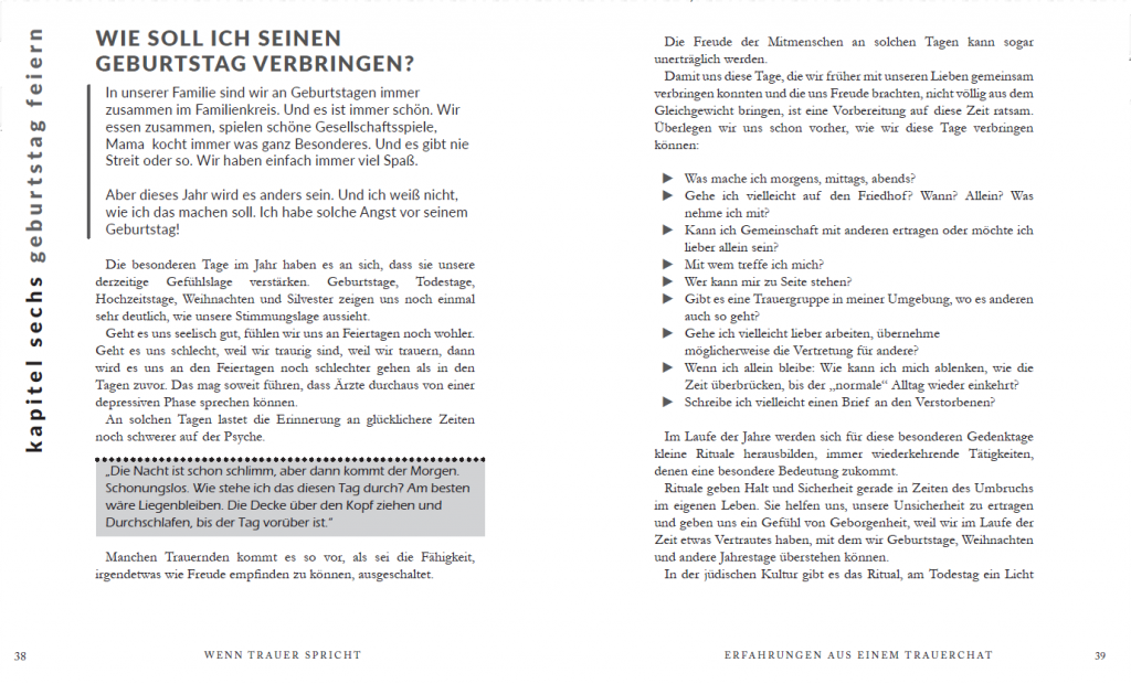 - Inhalt: Das Buch präsentiert anonymisierte Zitate von Trauernden, ergänzt um verständliche Hintergrundinformationen.