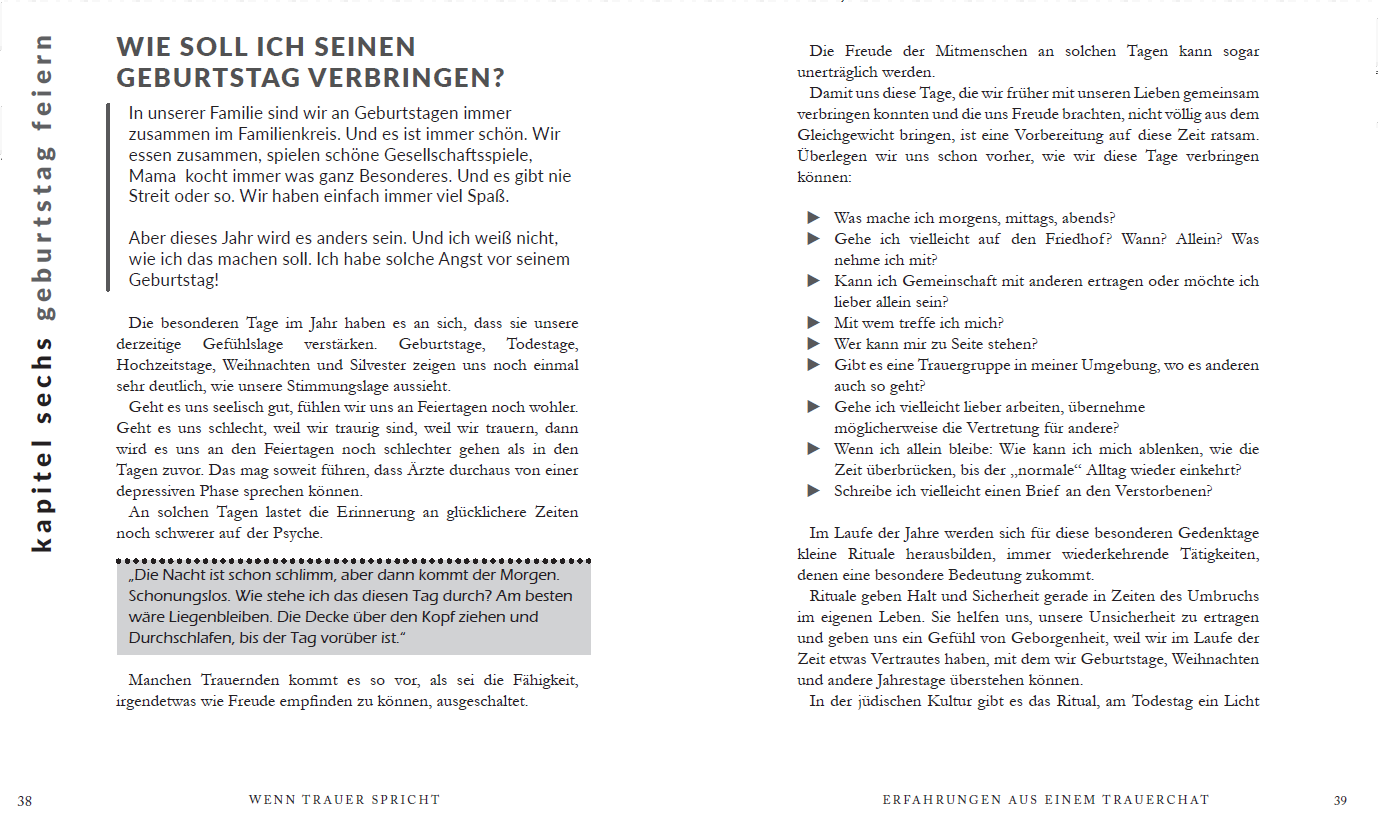 - Inhalt: Das Buch präsentiert anonymisierte Zitate von Trauernden, ergänzt um verständliche Hintergrundinformationen.